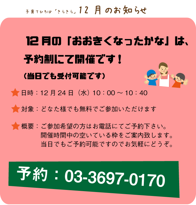 【子育て広場】12月24日は「おおきくなったかな」開催です