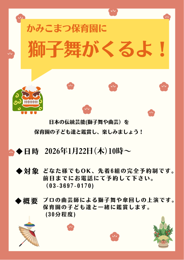 【子育て広場】1月22日は獅子舞がきます!どなたでも参加OK!